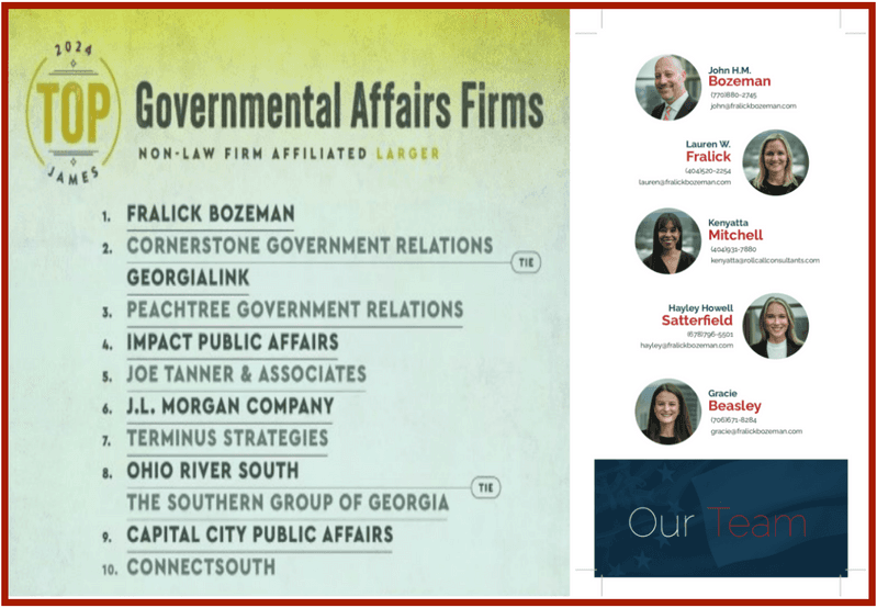 We are pleased to report that last week James Magazine ranked Fralick Bozeman Public Affairs as the Best-in-Class lobbying firm within the larger non-law category. This was quite the honor, considering James ranked Fralick Bozeman Public Affairs as #1 lobbying firm in Georgia in 2023 as well, but in the smaller firm category.